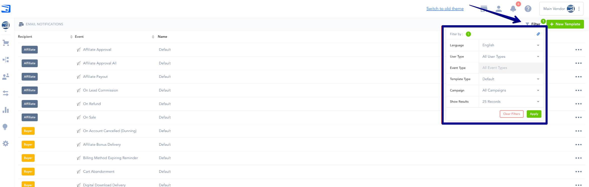 Select the user type of the email. You can select Buyer, Affiliate, or Vendor notifications.