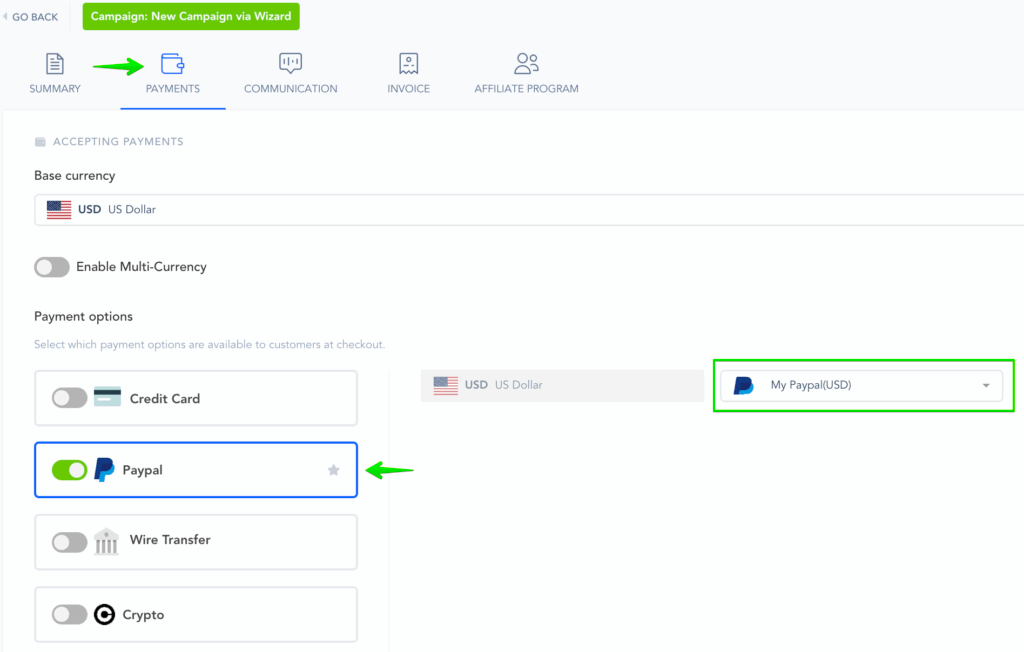 After adding the new payment gateway in the Integrations Section, vendors can go to the related Campaign and enter the Campaign Settings.