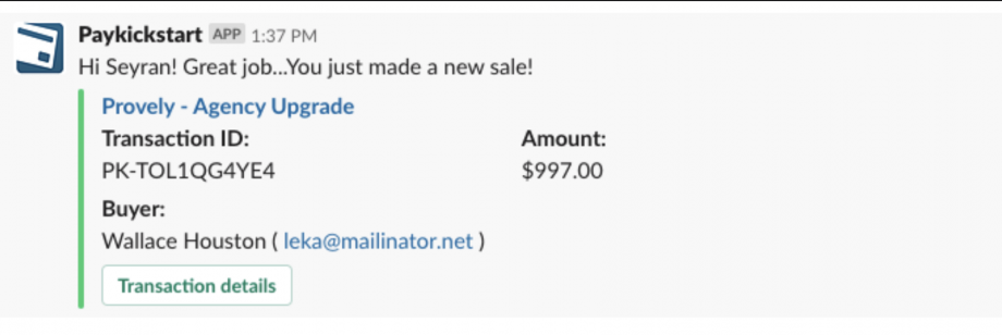 Example Slack notification if event – New Sale.