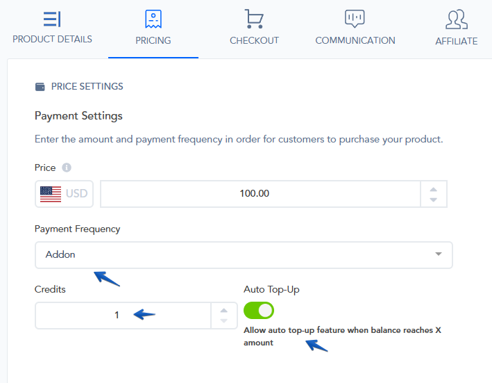 Auto Top-Up: Define if this add-on is a one-time purchase, or if Credit Top-ups are allowed, where if the customerโs balance reaches a specific amount, they will automatically be billed to add-on the credits back to full usage.