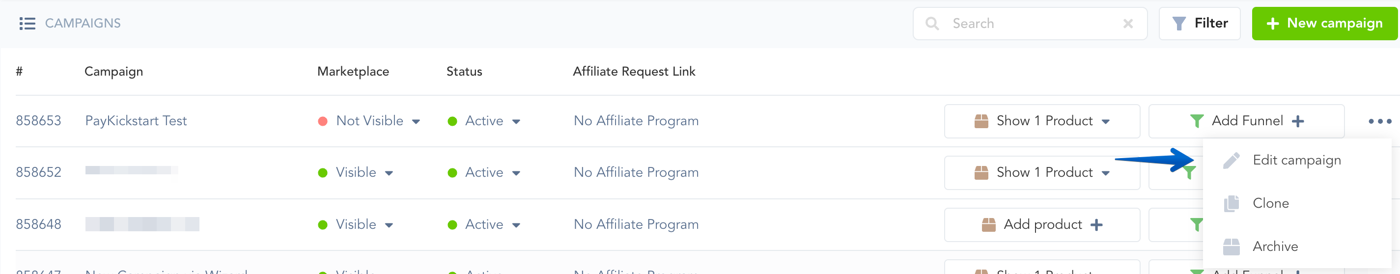 Step 1: Locate the campaign you want to set this warning or purchase block with and access the related campaign settings.