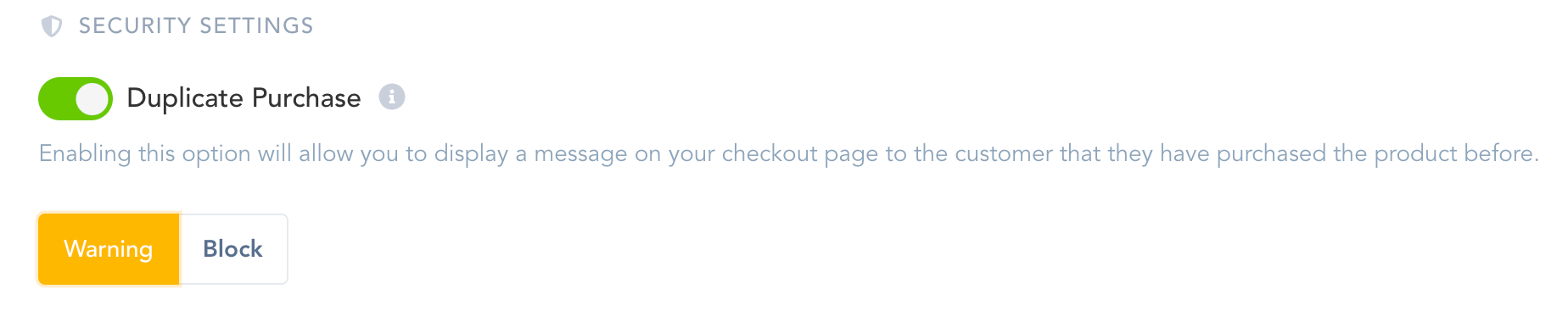 We recommend enabling both, the Warning and the Block feature, if you wish to notify customers they have already made a purchase of the product.