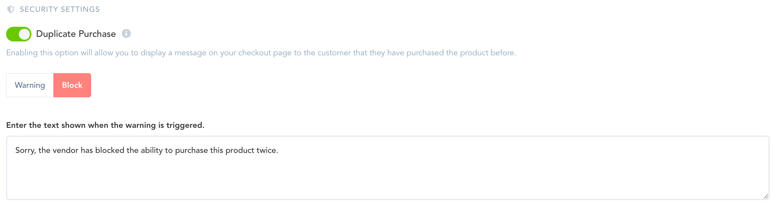 Vendors can also completely block the duplicate purchase of the product if needed. Vendors can also add a message and set a time length(in minutes) for how long they want to block the duplicate product purchase for customers.