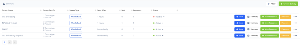 The dashboard will now show you a summary of that survey you created, along with links to preview it from a customerโs standpoint. Once responses start coming in, the View Responses button will be enabled for you to see the responses.
