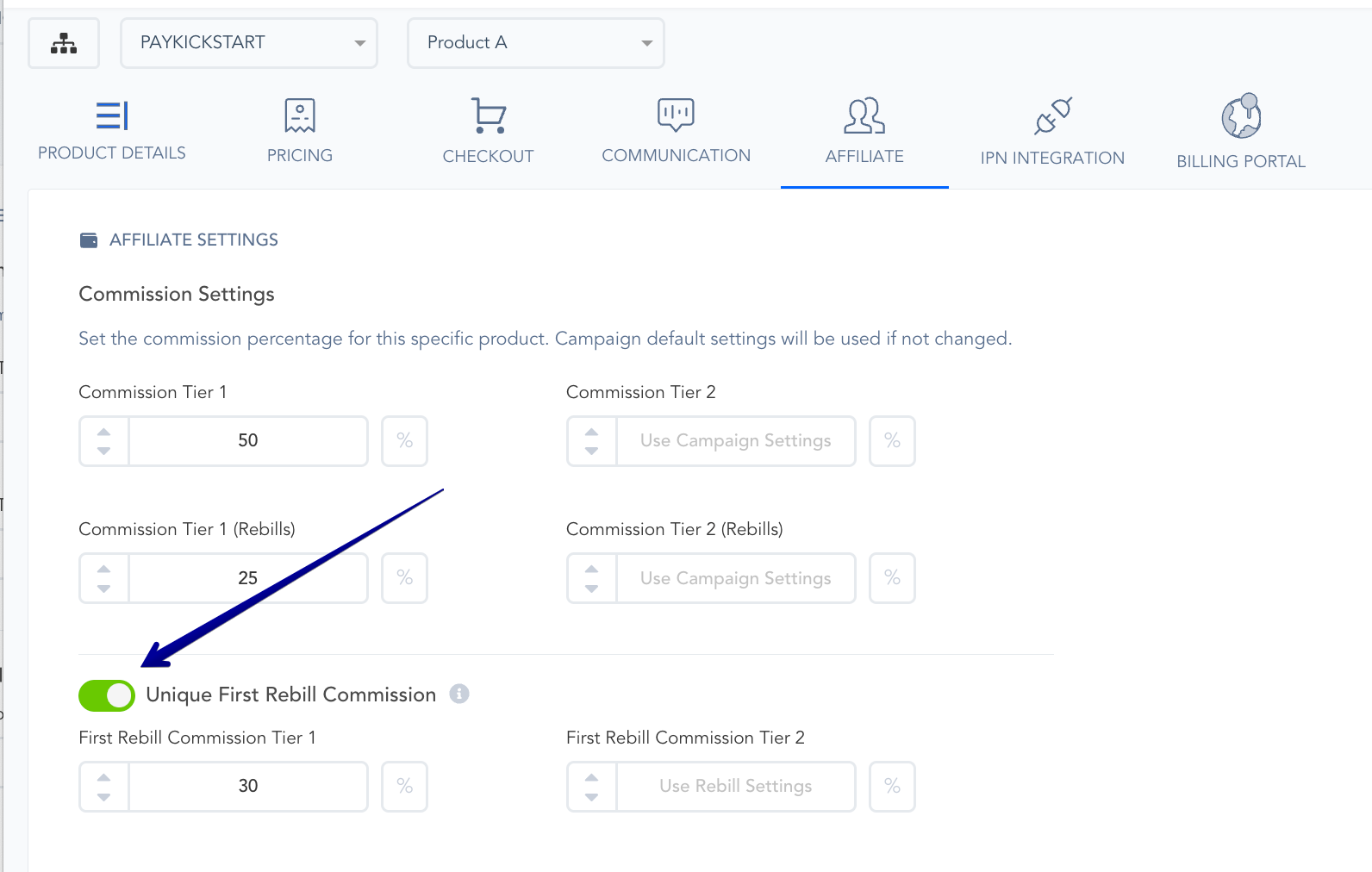 If needed, you can also give a special commission % for the first rebills. Simply enable the toggle switch, Unique First Rebill Commission.