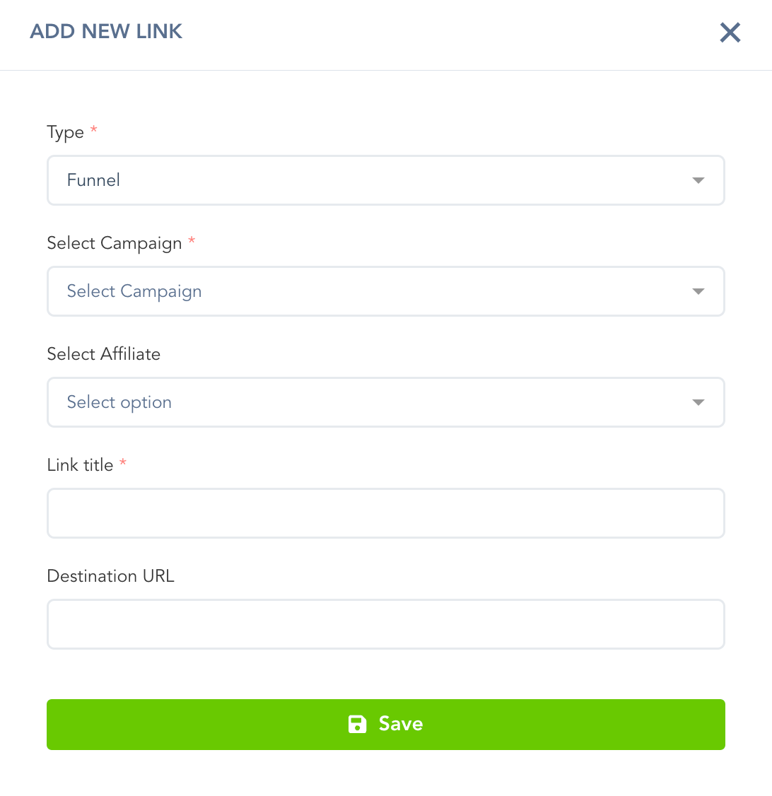 Please select the Campaign and Funnel that the link should be associated with, provide a unique name for identification purposes, and specify the URL to which the tracking link should redirect.