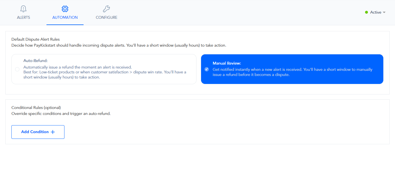 Navigate to the Automation tab to decide how PayKickstart should handle incoming alerts. Because dispute windows are often only a few hours long, automation is highly recommended.