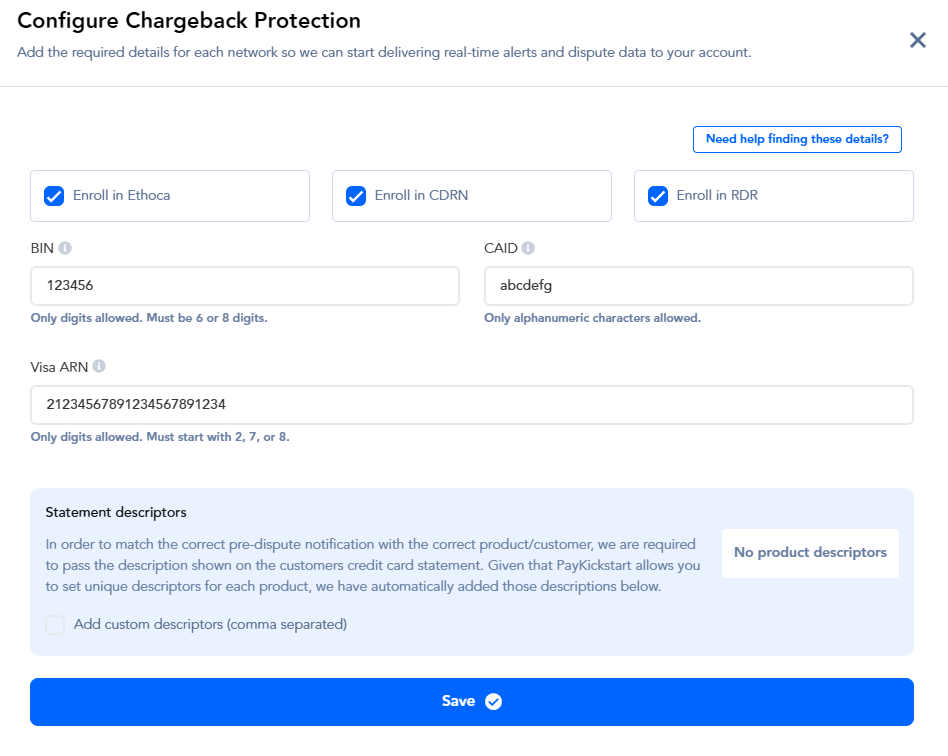 Accurate descriptors are vital for matching alerts. PayKickstart automatically pulls descriptors from your product settings, but you can add Custom Descriptors to ensure they match exactly what appears on the customer's bank statement.