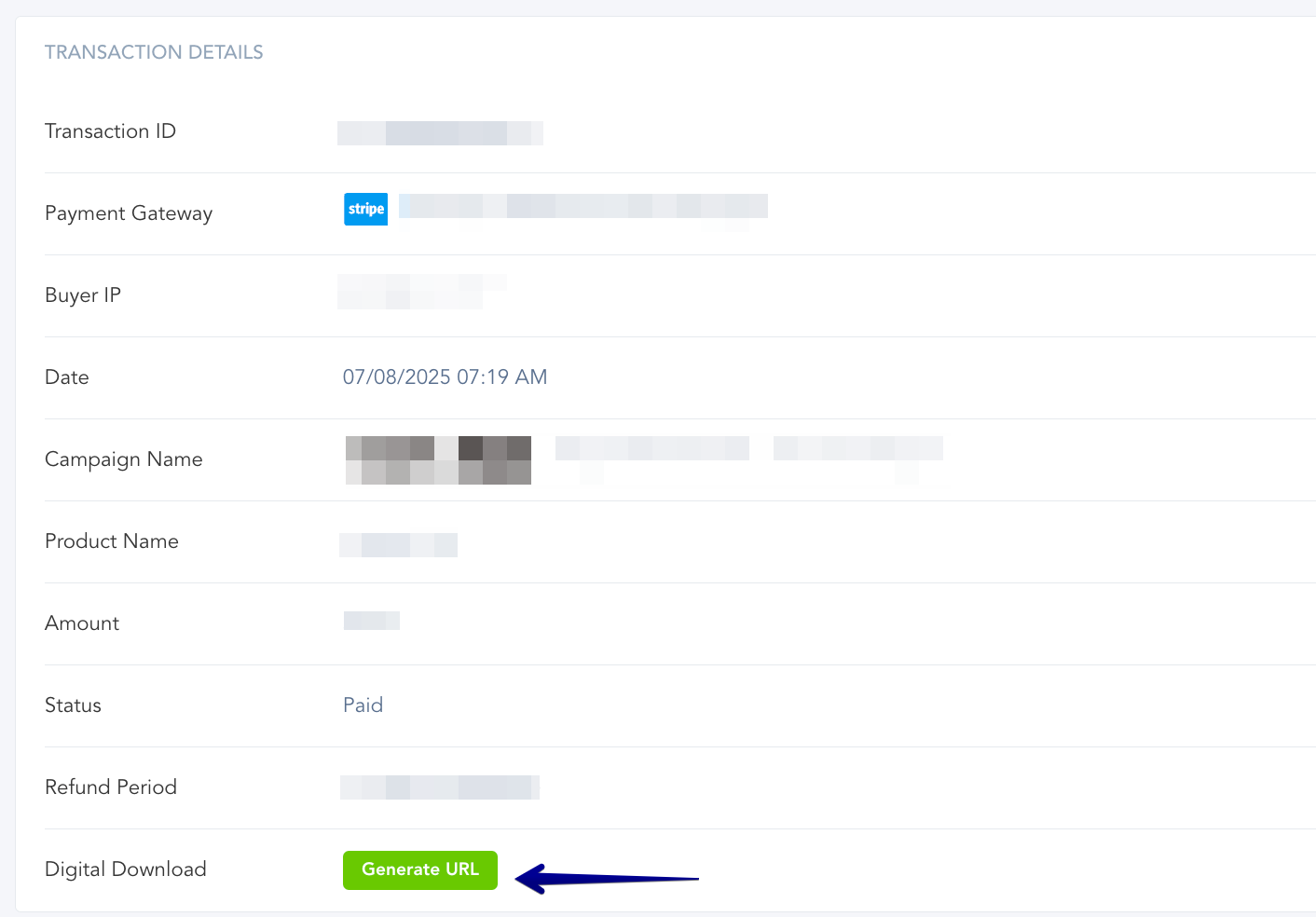 In the event that a customer's download link has expired, you can manually generate a new one by accessing their transaction, selecting Transaction Details on the Payments > Transactions page, and clicking the Generate URL button. This action will reset the download link for that specific customer.