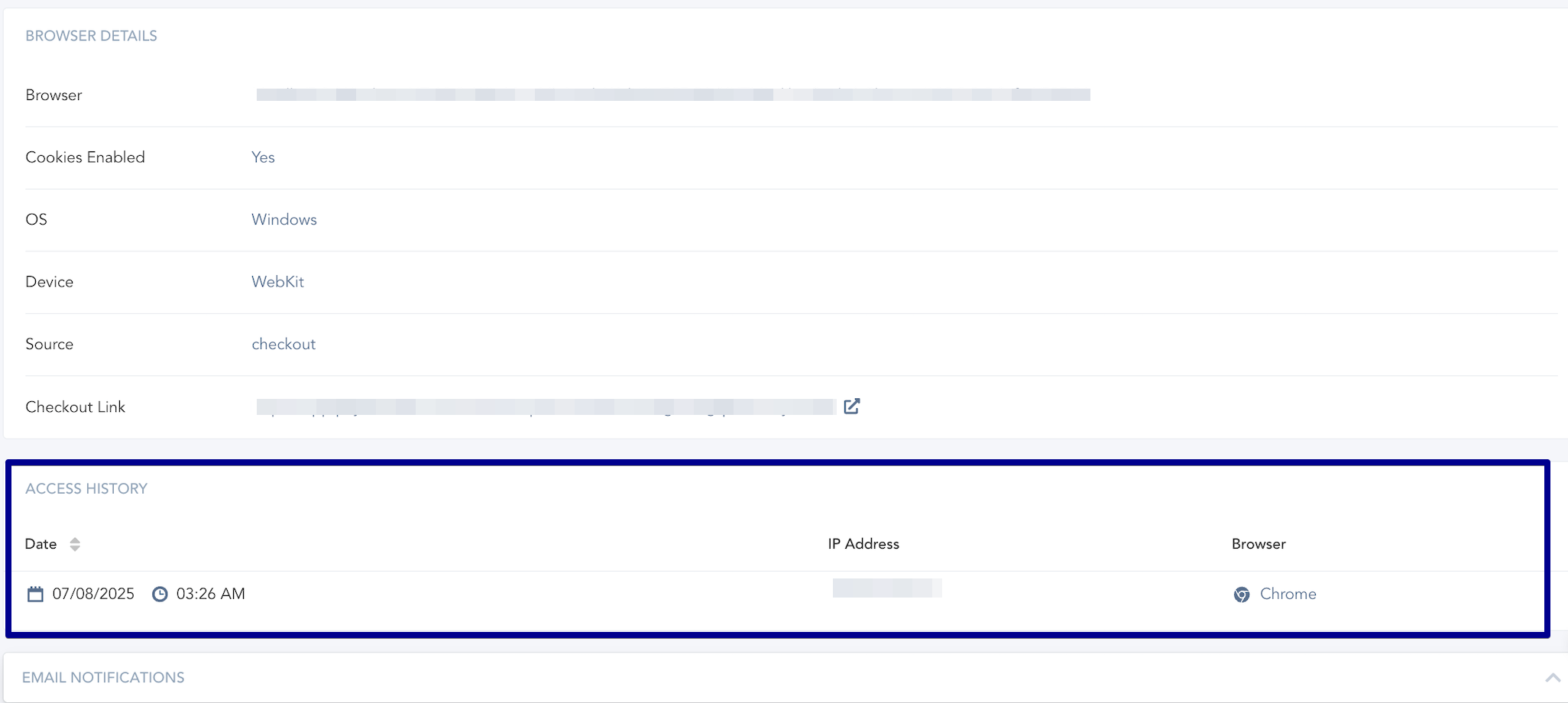 If needed, you can go to the customer’s purchase transaction to view the Digital Download access history that is triggered based on the following options: